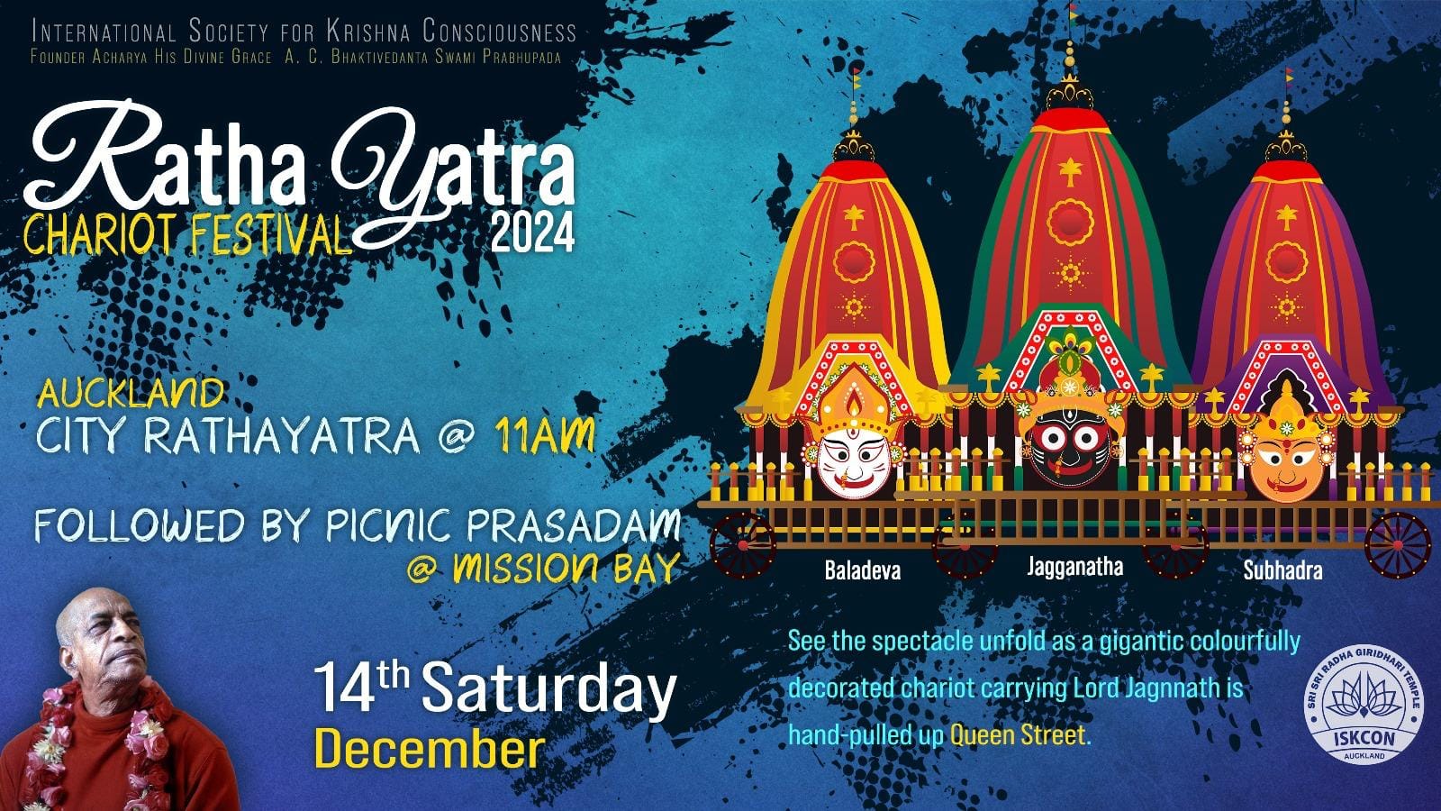 Festivals Auckland City Rathayatra 2024 11 AM, Saturday 14th December 2024 Staff October 19, 2024 — 1 minute read 11 AM, Saturday 14th December 2024 Share this post The link has been copied!
