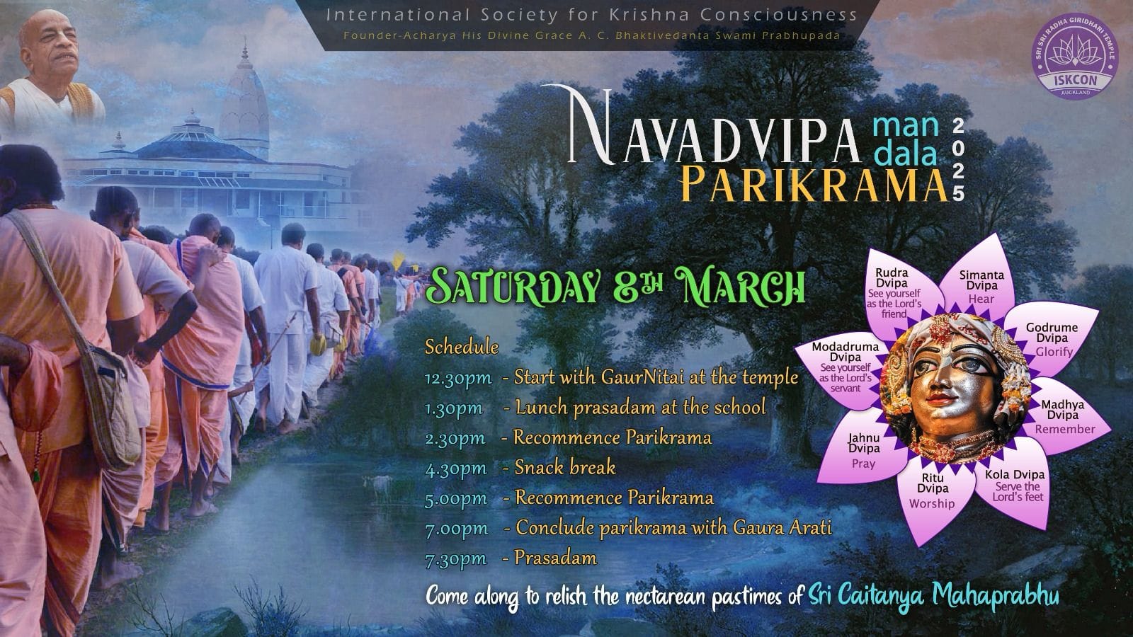 FestivalsEvents Sri Navadvipa Mandala Parikrama 2025 ISKCON Auckland February 19, 2025 — 1 minute read Saturday 8th March 2025 from 12:30pm around the Hare Krishna Auckland farm. Share this post The link has been copied!