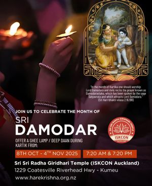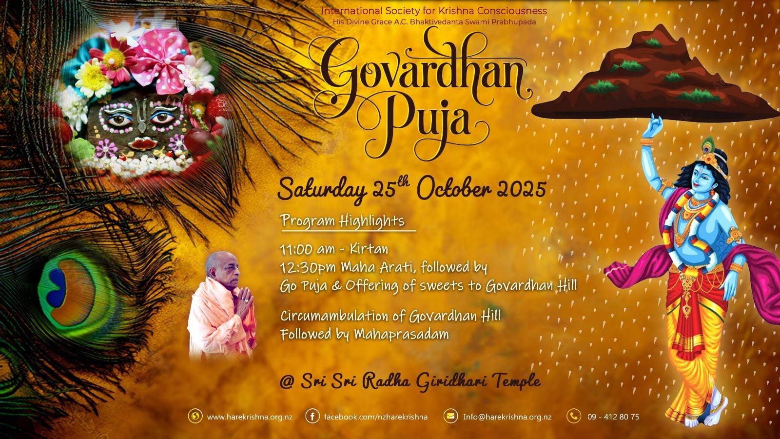 Hare Krishna! Celebrate Govardhan Puja with ISKCON Auckland at Sri Sri Radha Giridhari temple on Saturday 25th October 2025.