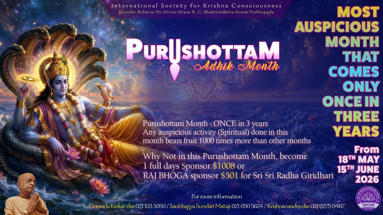Hare Krishna! This year, Sri Purushottam Adhik Month begins on May 18th until June 15th, 2026.