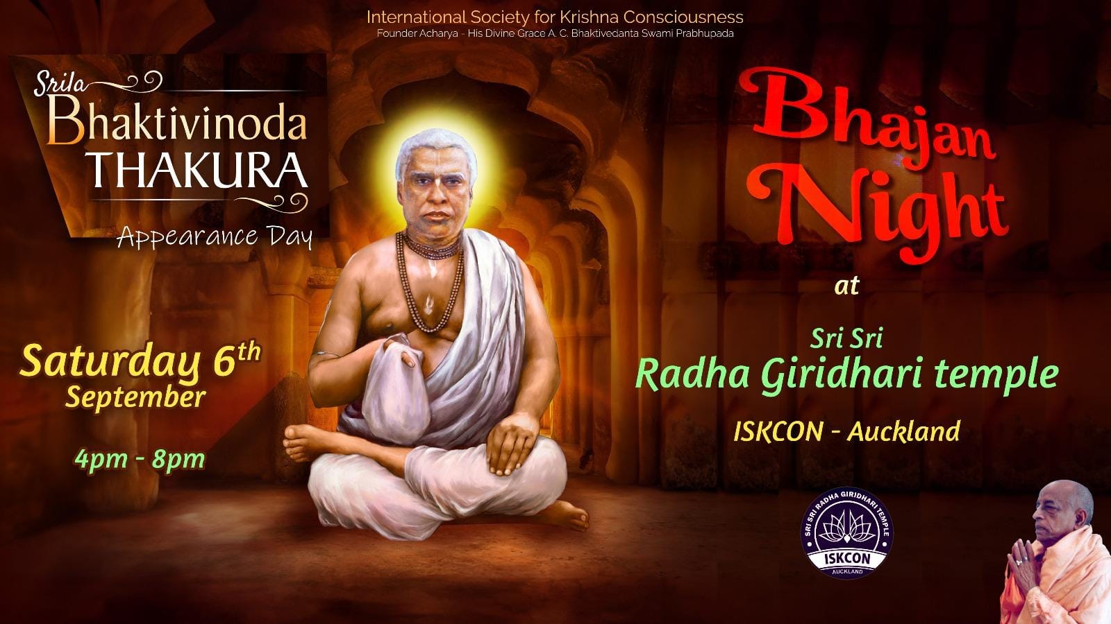 EventsFestivalsKirtan Srila Bhaktivinoda Thakura Appearance Day 2025 ISKCON Auckland August 13, 2025 — 1 minute read Saturday 6th September 2025 - Vaishnava Bhajan Night @ 1229 Coatesville Riverhead Hwy, Kumeu - Auckland Share this post The link has been copied!