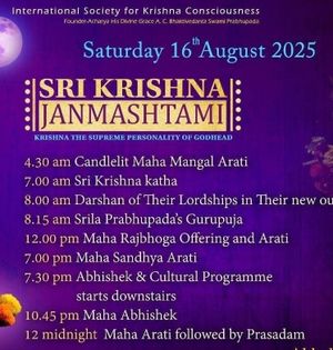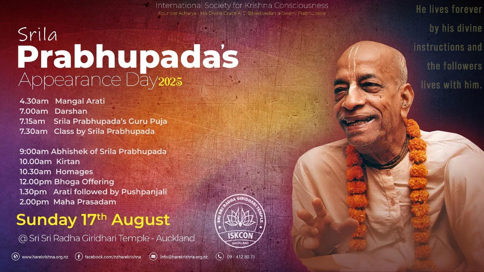 As devotees and well-wishers around the world commemorate this special day with kirtan, abhishek, homages and feasting, we welcome you to join us on Sunday 17th August 2025 at ISKCON Auckland's Sri Sri Radha Giridhari temple to honour the life and teachings our beloved ISKCON Founder-Acharya His Divine Grace A.C. Bhaktivedanta Swami Prabhupada's Appearance Day.