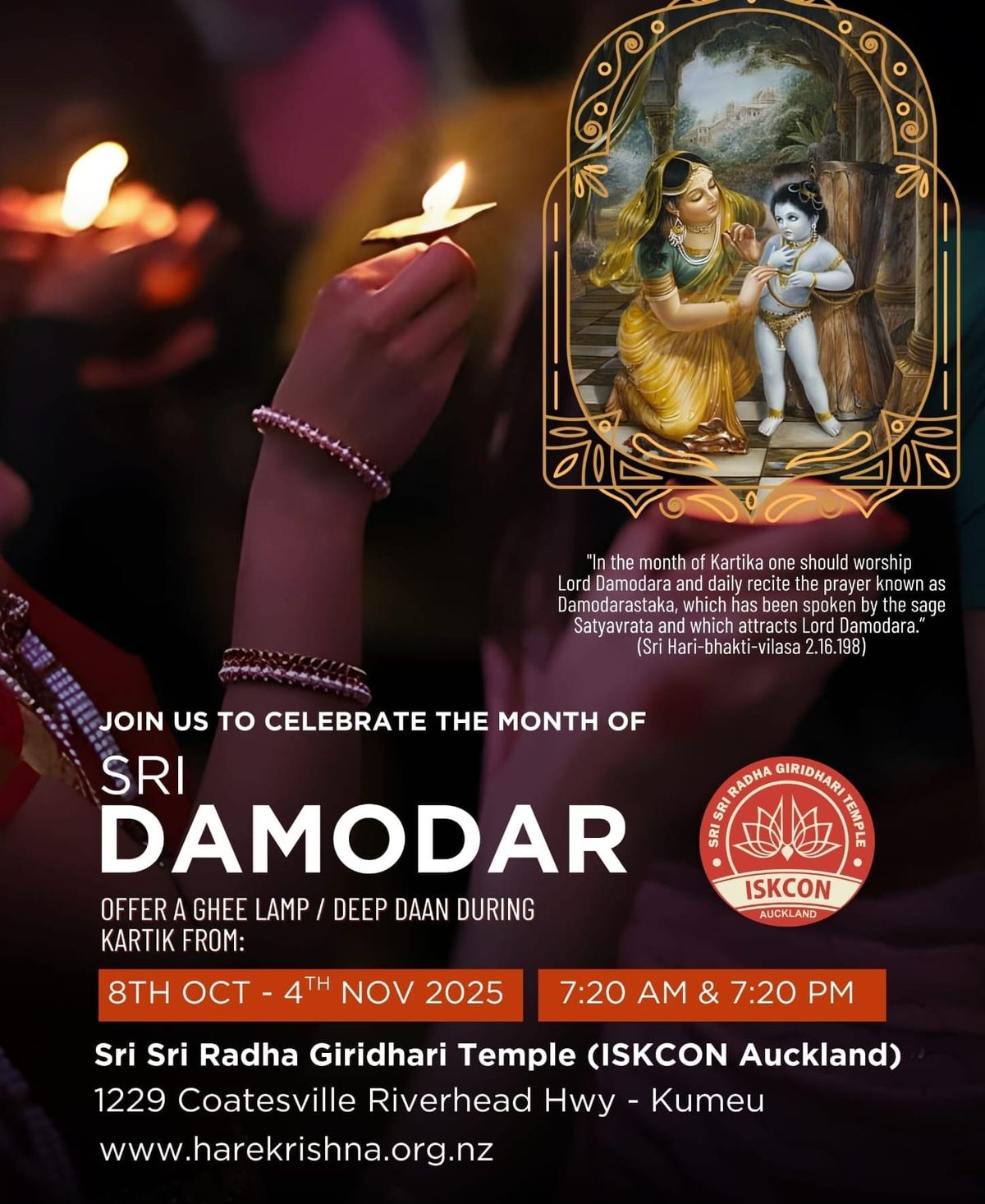 Join us in observing the sacred month of Sri Damodar from 8th Oct to 5th Nov 2025 at Sri Sri Radha Giridhari Temple. All are welcome to offer ghee lamps (deep daan) daily after Shringar Darshan at 7:20 am and Gaura Arati at 7:20pm. *Free diyas will be...