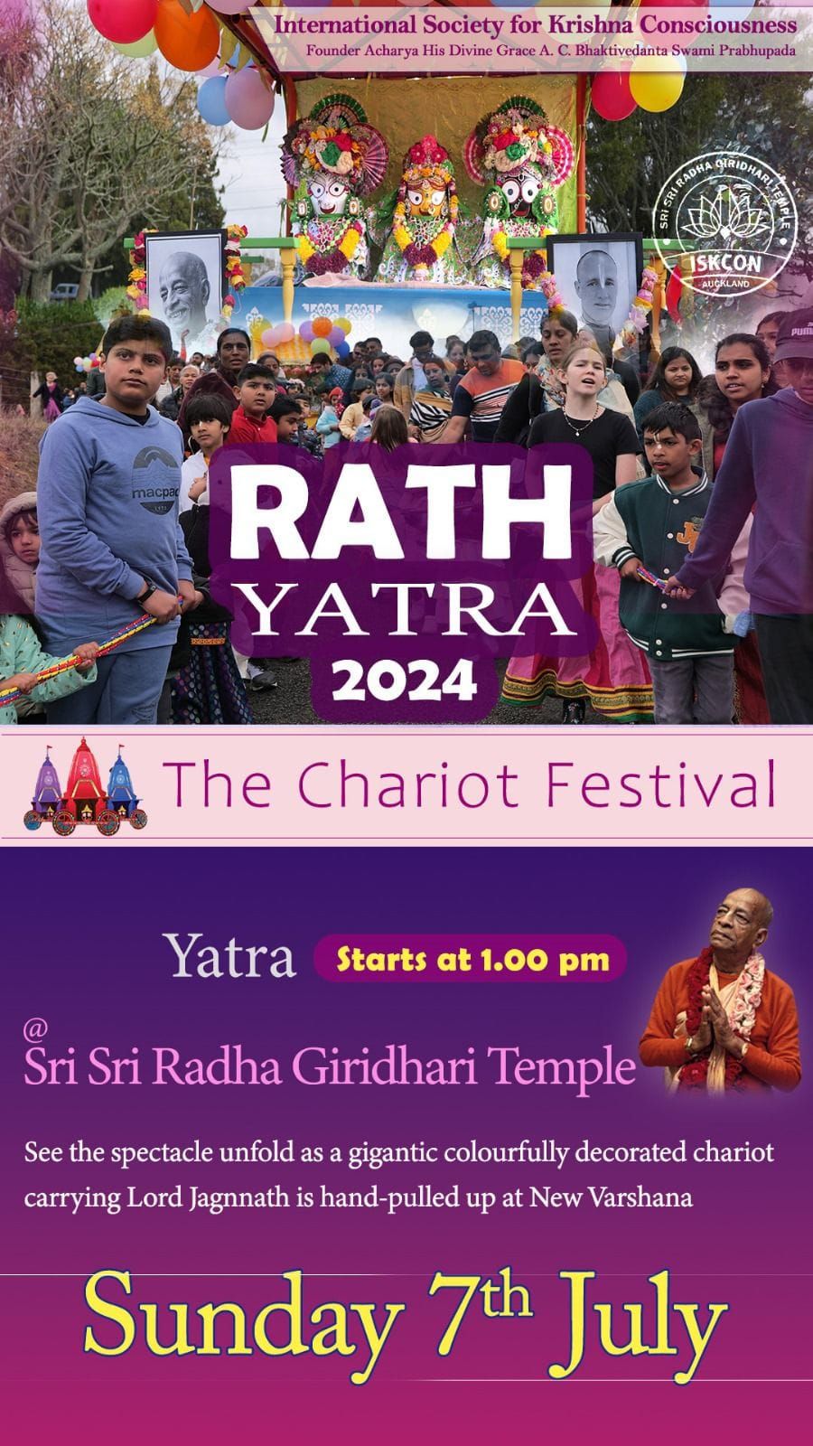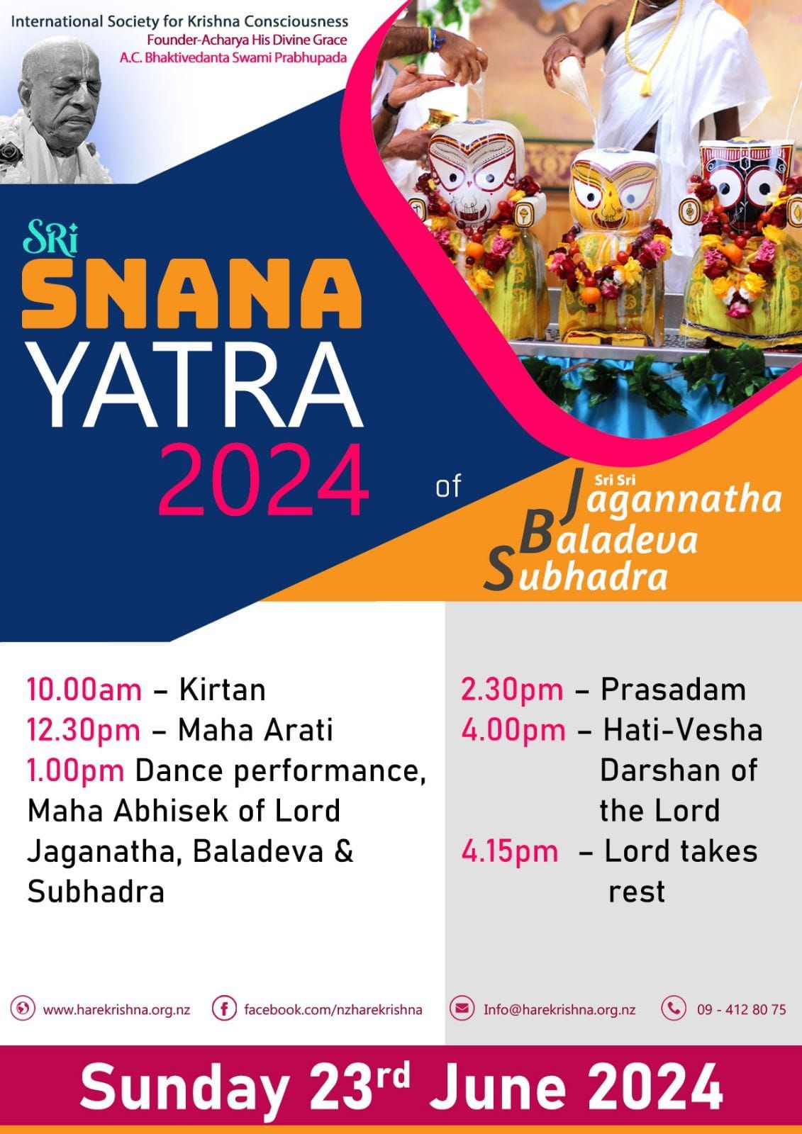 Snana Yatra festival at ISKCON Auckland on Sunday, June 23, 2024, starting from 10:00 AM.