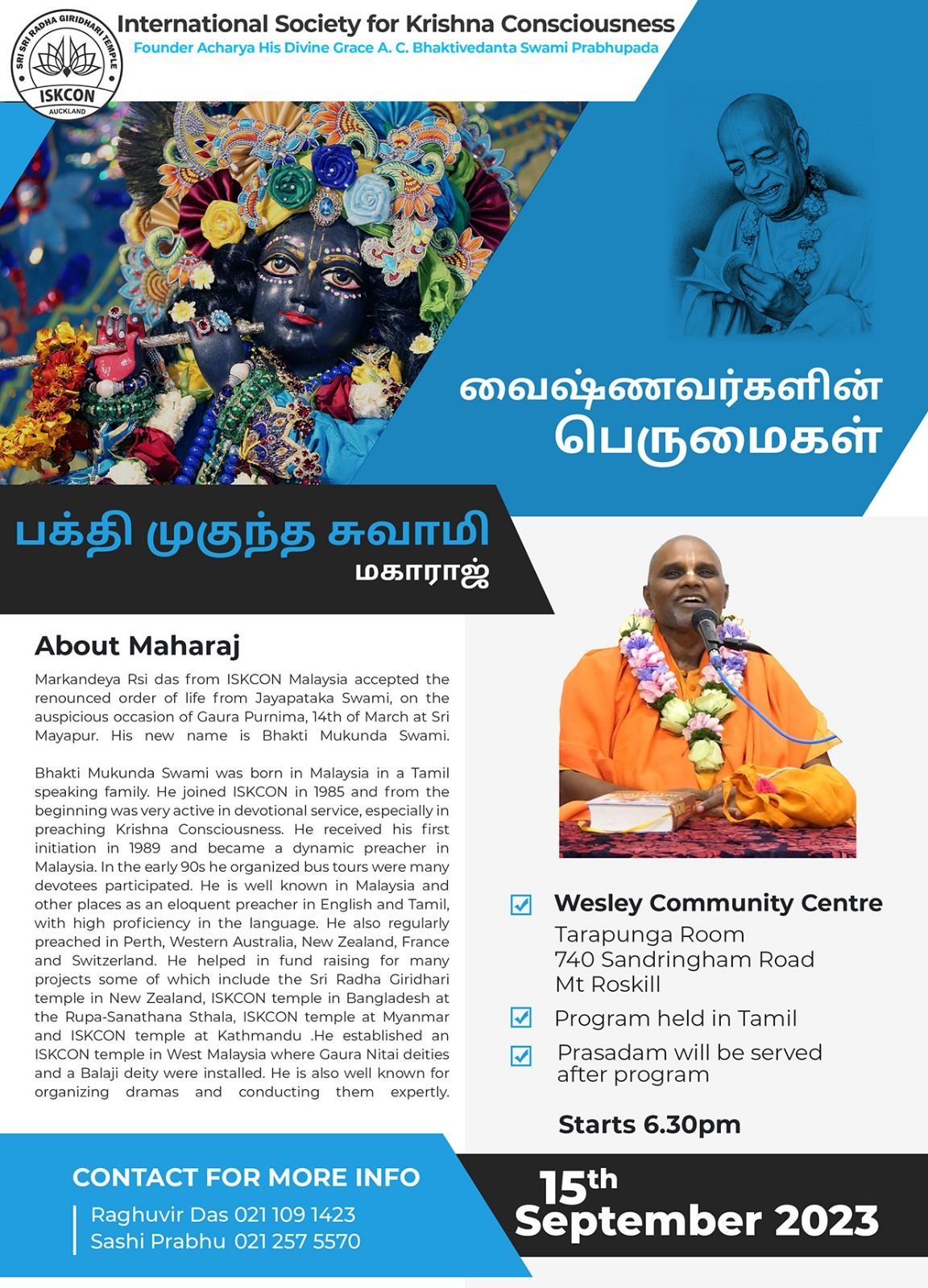Join us for an illuminating evening of spiritual insight as His Holiness Bhakti Mukunda Swami shares his wisdom on the "Glories of Vaishnava" in the Tamil language.